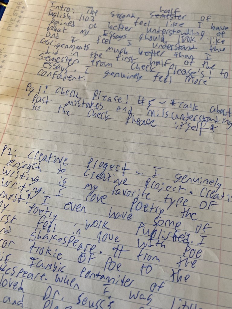 Writing all kinds of essays I think has really helped me grow as a writer. Looking back at everything I’ve accomplished I feel as if I’ve grown as a writer. From breaking down the directions of Check, Please! To researching scholarly articles for my final essay. To free form poetry for my creative project. I feel as if reading through my work from oldest to newest you can see my improvement not only as a writer but as a student.